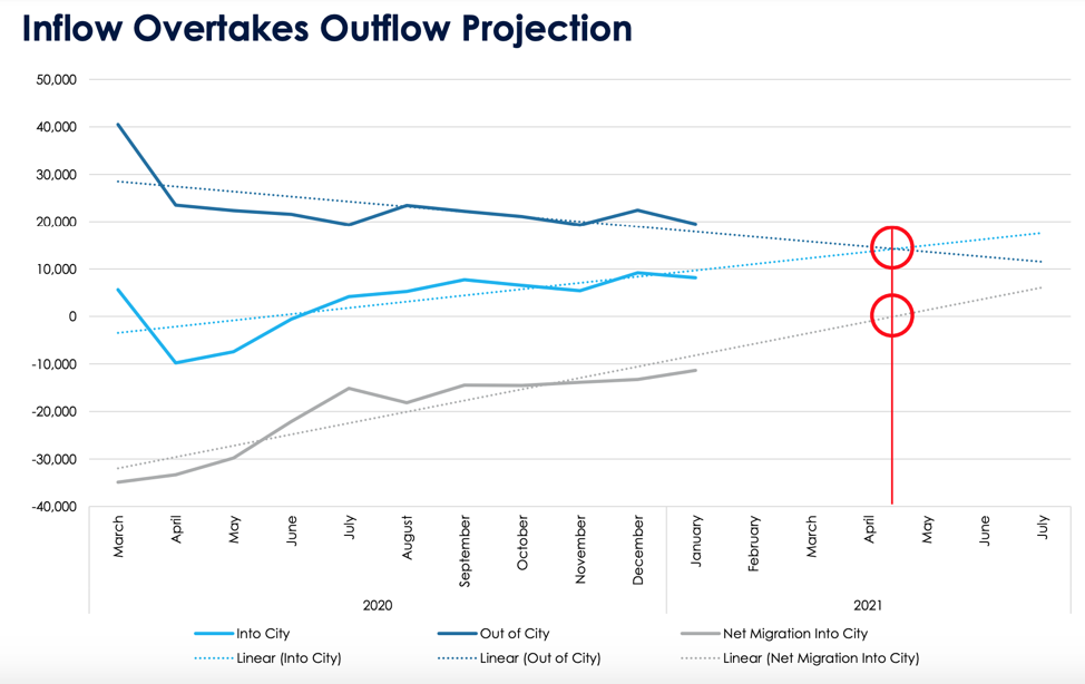 As you can see, (and this data comes from Nancy Packes and Eastdil Secured), the net outflow of people from the City is expected to reverse *this month*. This is being driven by a robust recovery in employment and surprisingly fast progress on the vaccine front.
