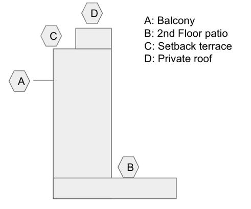 There are typically four types of outdoor space that you’ll find in an apartment building. Here’s an example from one building: